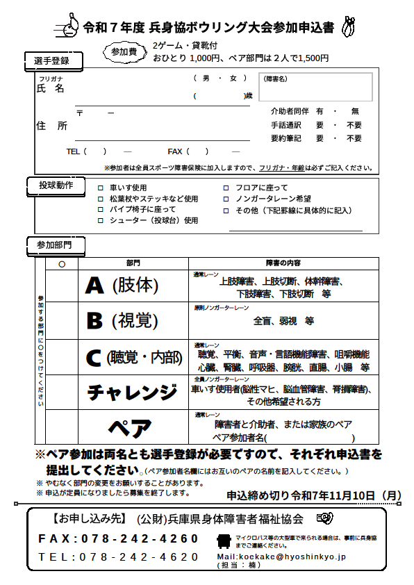 当日は肢体障害者部門、聴覚障害者部門、視覚障害部門、ペア部門、チャレンジ部門の5つに分かれてボウリングを楽しみ、それぞれの部門ごとに1位~3位までの入賞者には賞品が授与されます。
