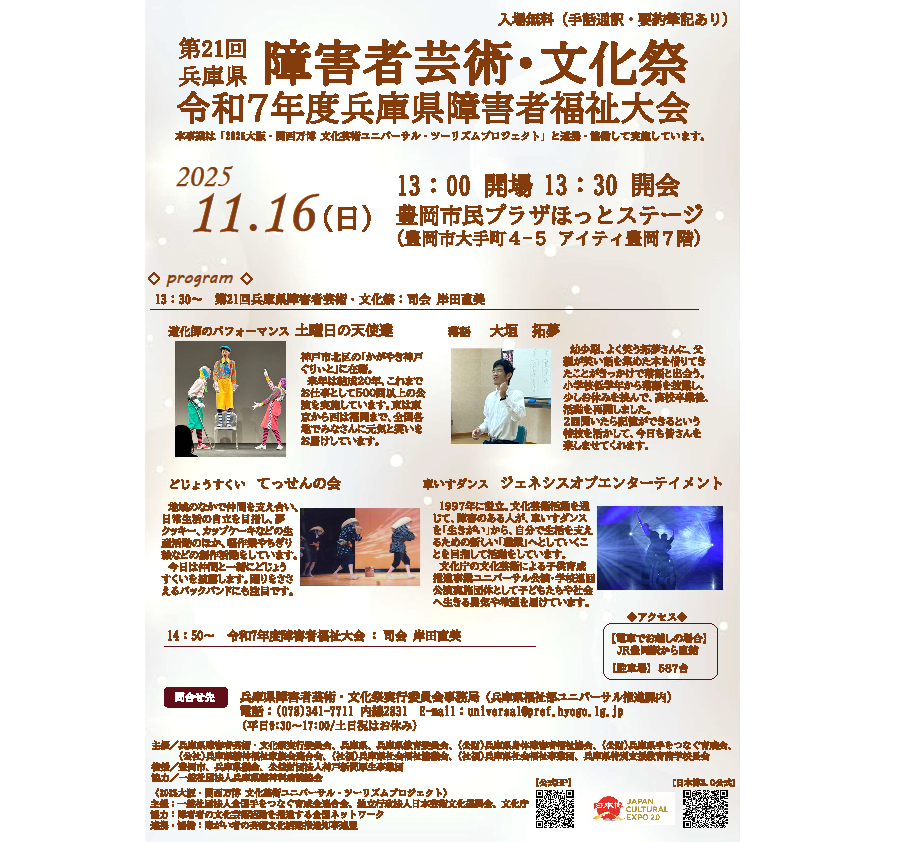 「第21回兵庫県障害者芸術・文化祭」及び「令和7年度兵庫県障害者福祉大会」兵庫県と兵庫県障害者芸術・文化祭実行委員会の主催により、下記の日程で同時開催されます。