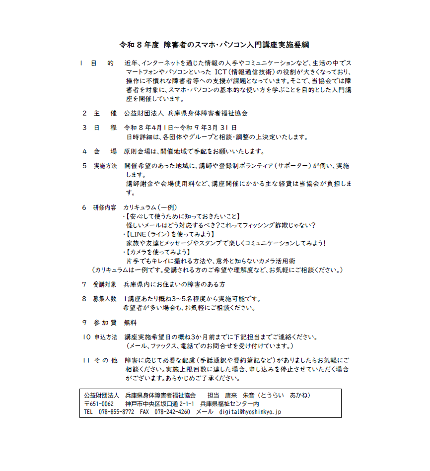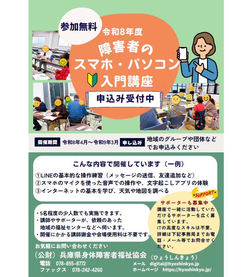 2026.2.10 【受付開始】令和8年度障害者のスマホ・パソコン入門講座 一覧に戻る 2026年2月 月 火 水 木 金 土 日 1 2345678 9101112131415 16171819202122 232425262728 « 1月 アーカイブ2026年 2月 (1) 1月 (1) 2025年 12月 (3) 11月 (2) 10月 (4) 9月 (2) 8月 (4) 6月 (3) 4月 (1) 2月 (1) 1月 (2) 2024年 12月 (2) 11月 (2) 10月 (2) 8月 (1) 7月 (1) 6月 (3) 5月 (1) 4月 (4) 3月 (1) 2023年 11月 (2) 10月 (2) 9月 (2) 8月 (1) 7月 (1) 6月 (4) 5月 (1) 4月 (3) 2月 (1) 1月 (3) 2022年 12月 (3) 11月 (2) 10月 (3) 8月 (1) 4月 (1) 3月 (2) 2月 (1) 2021年 12月 (2) 10月 (3) 9月 (1) 8月 (2) 7月 (1) 6月 (3) 4月 (1) 3月 (5) 1月 (1) 2020年 10月 (1) 6月 (2) 5月 (3) 4月 (1) 3月 (3) 2019年 6月 (1)